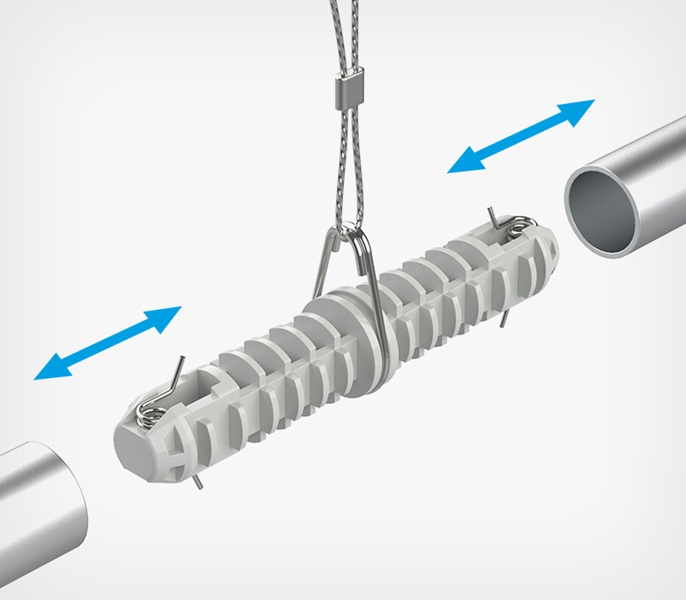 Соединитель пластиковый прямой для профиля AIRTRACK - предназначен для надёжного соединения двух профилей в одну удлинённую конструкцию. Изготовлен из прочного пластика и оснащён встроенной металлической петлей и пружиной, обеспечивающими фиксированное крепление внутри трубок. Петля позволяет легко подвесить систему AIRTRACK к потолку с помощью металлического троса или цепи, упрощая монтаж
