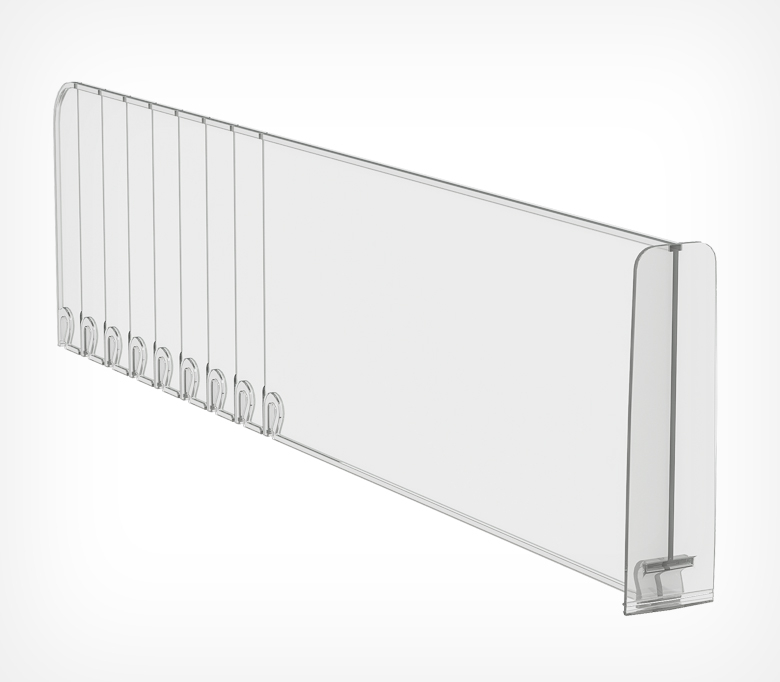 Разделитель DIV120-BT120 выс.120 мм c передним огран. 120 мм — пластиковое изделие, которое используется для выкладки товаров средних и крупных размеров. Некоторые характеристики: высота переднего ограничителя: 80 мм; шаг обламывания: 25 мм; материал: прозрачный ударопрочный пластик тип крепления: замок на Т-профиль. Особенности: используется для упаковки, например, с нарезками сыров, колбасных и мясных изделий, пачками с крупами, сухими завтраками, детским питанием, колготками, передний ограничитель удерживает товар от падения с полки, насечки по длине позволяют уменьшать размер изделия для разной глубины полок.