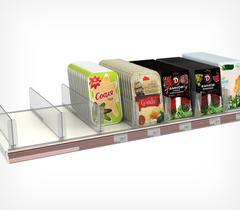 Применяется при выкладке товаров средних и крупных размеров. Ограничитель предотвращает падение товара, расположенного у переднего края полки.
