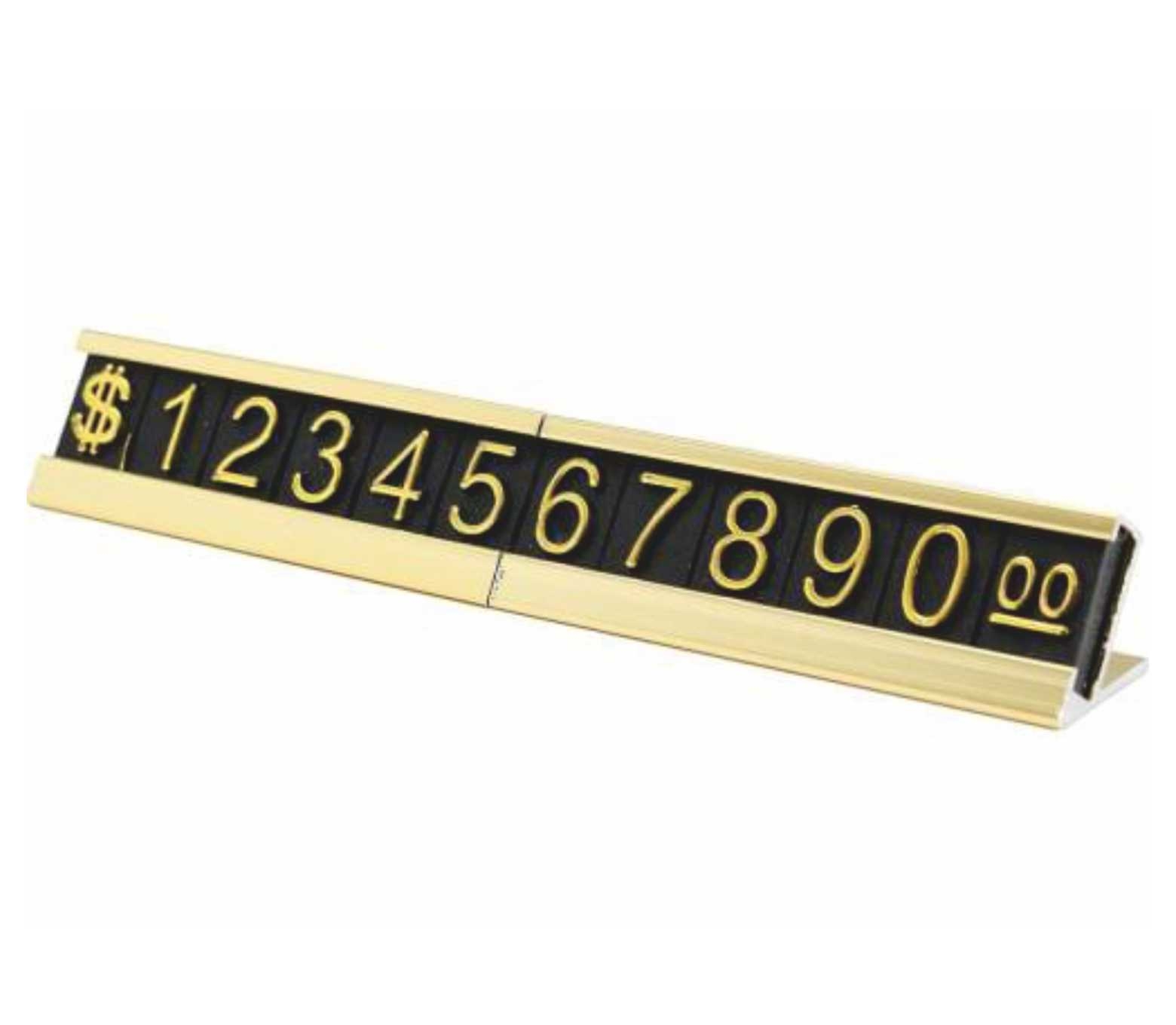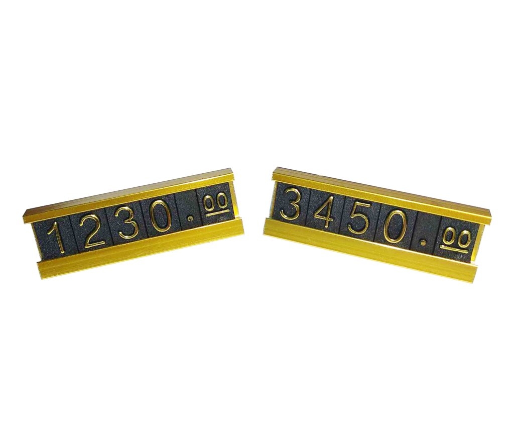 Привлекательный ценник, заставляющий покупателя обратить внимание. Цифры легко меняются, продолжительный срок службы. Миниатюрные цифры легко меняются, специальный профиль цифр, крепящихся друг к другу. Алюминиевый анодированный под цвет золото профиль, эффектно показывает стоимость Вашего товара.
