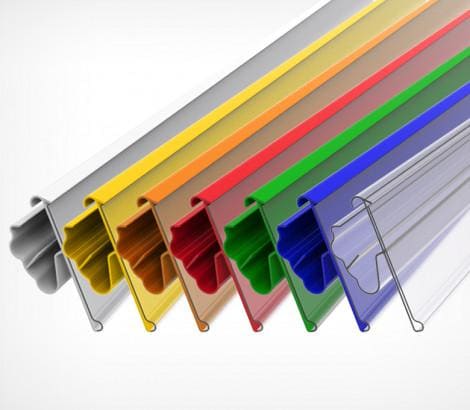 Фиксируется на стеллажах TEGOMETALL, MAGO, РУСЬ и подобных. Возможна установка двух положений наклона ценника к торцу полки. Высота - 39, 52, 60 мм