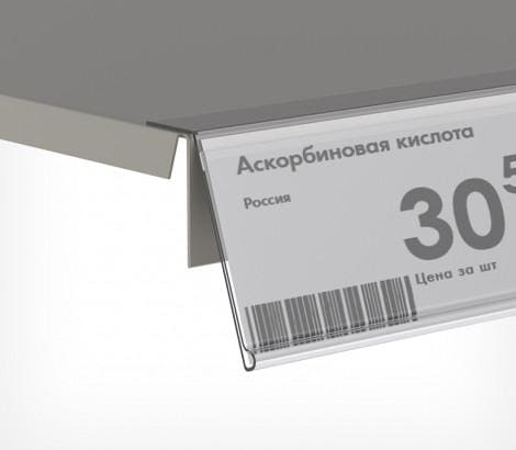 Особенность данной модели заключается в фиксации на верхнем крае полки, а угол наклона 15° служит для улучшения видимости ценников, особенно на нижних полках. Это обеспечивает удобное считывание информации покупателями.