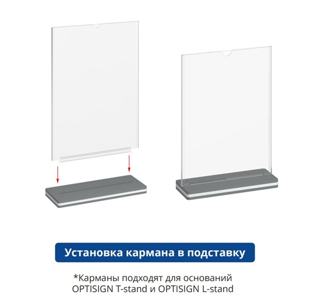 Основание подставки под меню OPTISIGN T-stand цвет серый — это держатель информации формата А4 и А5 который представляет собой подставку для рекламно-информационных листовок или меню. Конструкция предполагает установку кармана под углом 90° и 75° удобную верхнюю загрузку плакатов и лёгкую смену носителя