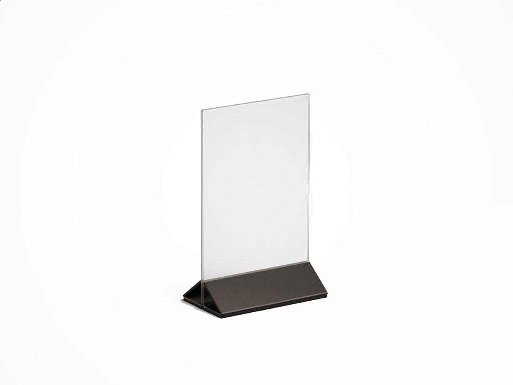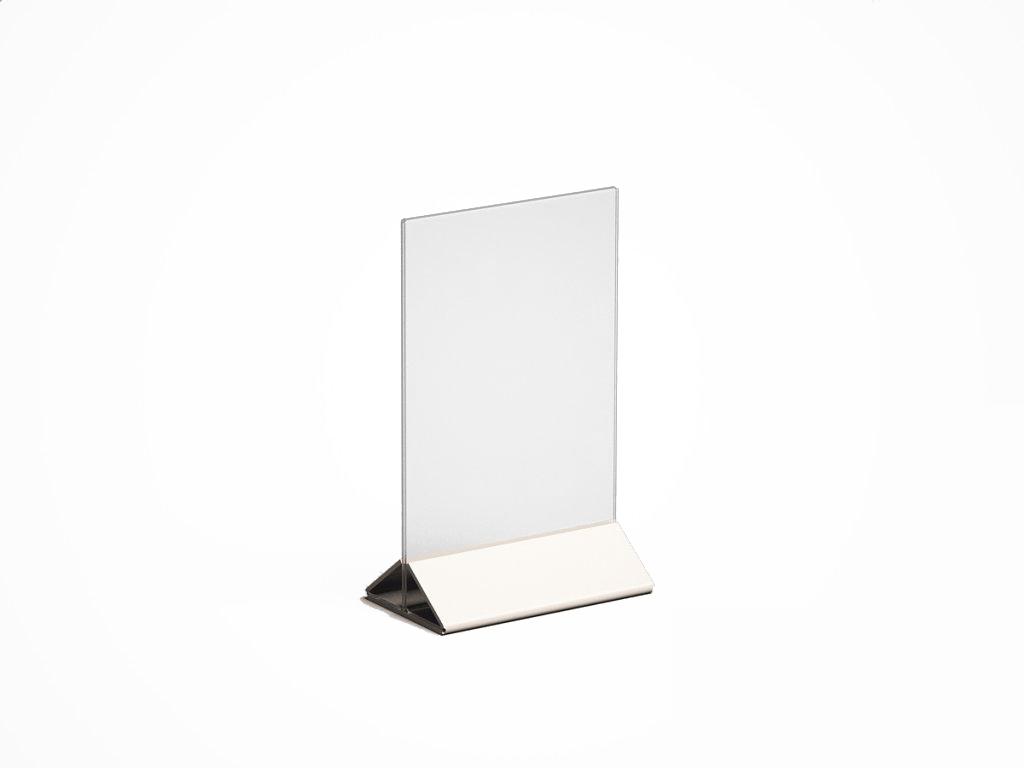 МЕНЮХОЛДЕР ФОРМАТА А-6, С НИЖНЕЙ ЧАСТЬЮ РАЗЛИЧНЫХ ЦВЕТОВ, КЛАСИЧЕСКОГО ВИДА.  СОСТОИТ ИЗ ДВУХ ЧАСТЕЙ, ПРОЗРАЧНОГО Т-ОБРАЗНОГО ПЛАНШЕТА И НИЖНЕГО ДЕРЖАТЕЛЯ, ТРЕУГОЛЬНОЙ ФОРМЫ. ВОЗМОЖНО НАНЕСЕНИЕ ЛОГОТИПА.