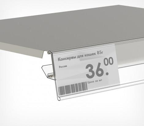 Ценникодержатель для стеллажей MODERN EXPO и КС РУСЬ. Обеспечивает надёжное крепление на краю полки, возможна установка под 2-мя разными углами к поверхности полки (рекомендуется устанавливать ценникодержатели на нижних полках под более острым углом к поверхности полки).