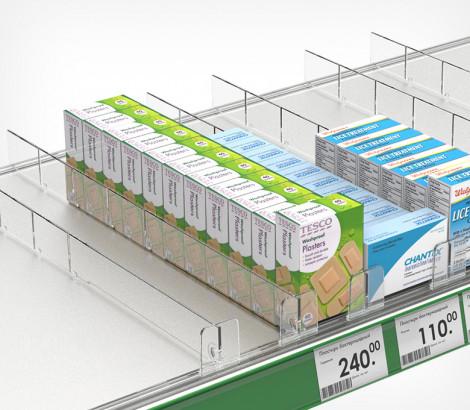 Применяется для организации на полке небольших легких товаров. Идеальное решение для организации выкладки сигарет, лекарств, парфюмерии, косметики.