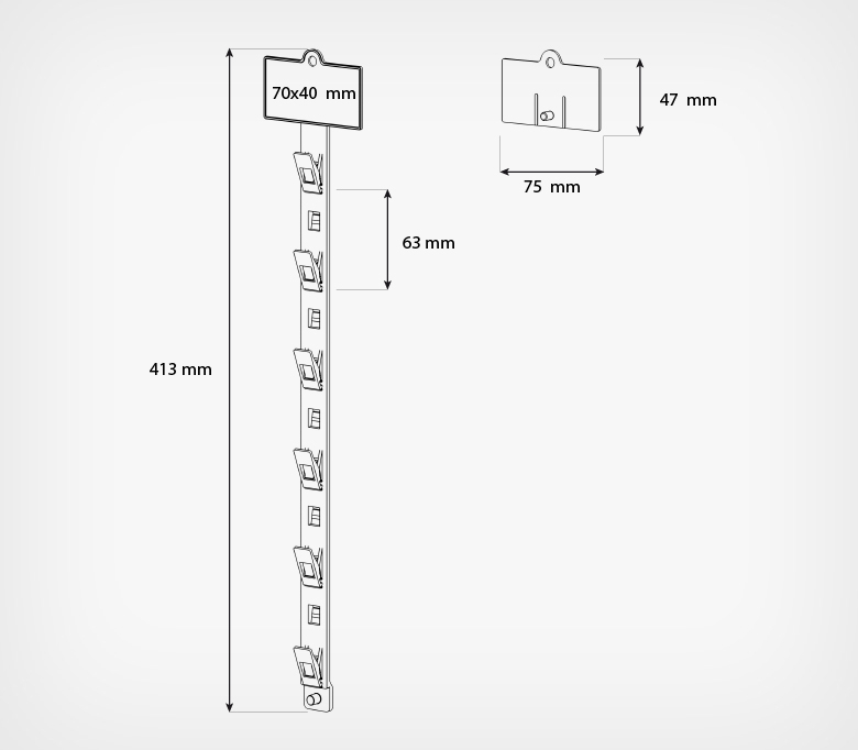Топпер для подвесной пластиковой страйп-ленты. Предназначен для крепления пластиковой страйп-ленты и размещения ценников или рекламных наклеек. Используется вместе со страйп-лентой для товаров в небольшой упаковке без отверстия для подвеса. В верхней части топпера предусмотрено отверстие для крепления с помощью специального металлического крючка для страйп-лент или хомута.